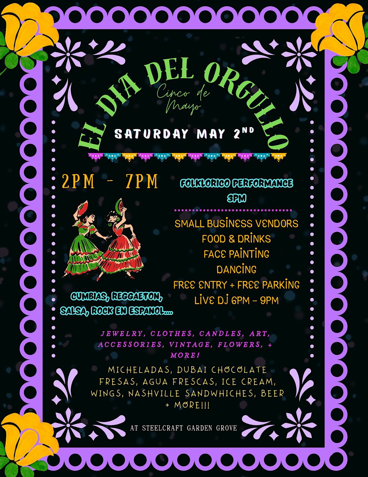 Get ready for some awesome vibes as we kick off Cinco de Mayo early! Join us on May 2, 2026 at SteelCraft Garden Grove, 12900 South Euclid Street, Garden Grove, CA. Bring your friends,family, and neighbors. Enjoy great food options, refreshing drinks, beer, micheladas, and soak up the fun atmosphere. Folklorico performance at 3pm, Vendors, Hair Tinsels, and much more. Make sure to grab your dancing shoes, DJ Edad will have you dancing from 6:00 PM - 9:00 PM Don’t miss out on this chill celebration!
