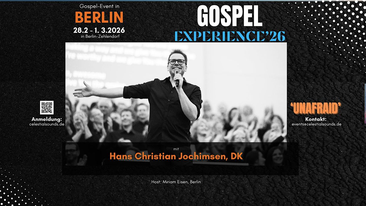Komm und sei dabei bei der unvergesslichen Gospel Experience26 in Berlin-Zehlendorf am 28.2. und 1.3. Lass dich von mitreißenden Chorsätzen und kraftvollen Liedern begeistern. Unser wunderbarer Gastdirigent, Hans Christian Jochimsen aus Dänemark wird dich und uns mit seiner warmen und humorvollen Art begeistern. Diese Veranstaltung vor Ort verspricht Tage voller Freude, Inspiration und Gemeinschaft. Verpasse nicht die Gelegenheit, dich mit anderen zu verbinden und den Geist der Gospelmusik zu feiern.