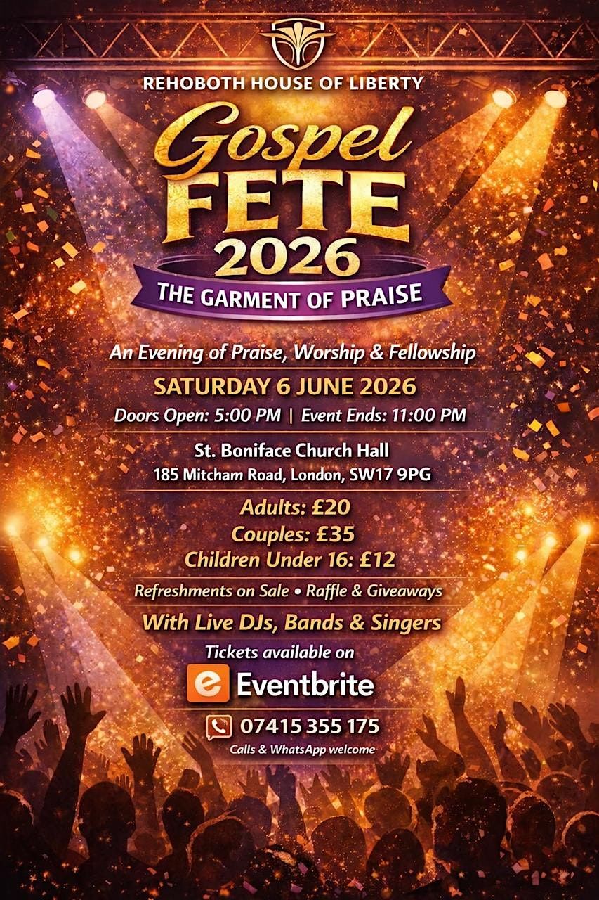 Get ready for an amazing in-person experience at Gospel Fete 2026! Join us as we celebrate with powerful songs, uplifting vibes, and a community full of joy. Dress in your praise garment and come ready to be inspired, connect, and have a blast. Don’t miss out on this unforgettable gathering—it's all about faith, fun, and fellowship!