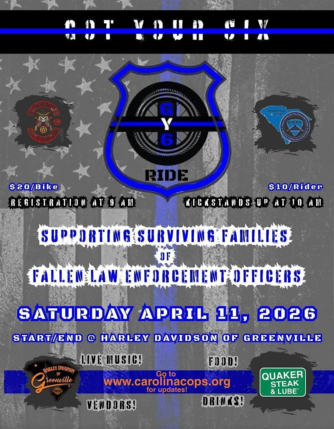 GOT YOUR 6 is a charity motorcycle ride raising money to support fallen officer's families. All proceeds are given to Carolina C.O.P.S non profit organization.