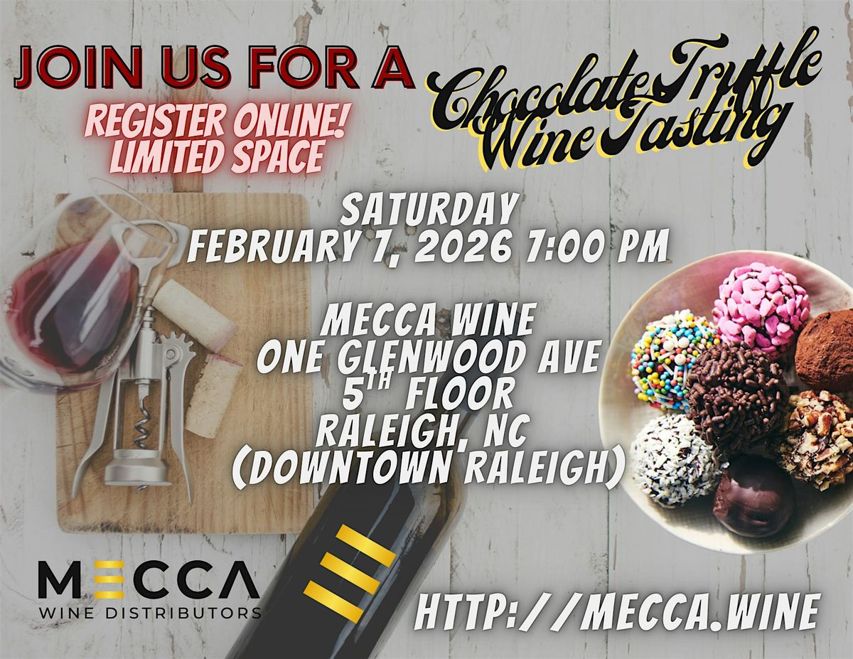 Indulge in an unforgettable night of decadence, discovery, and elevated taste. Join us on Saturday, February 7th at 7:00 PM for an exclusive Chocolate Truffle Paired Wine Tasting hosted at the stunning Mecca Wine Office, located on the 5th floor of One Glenwood Ave in downtown Raleigh.