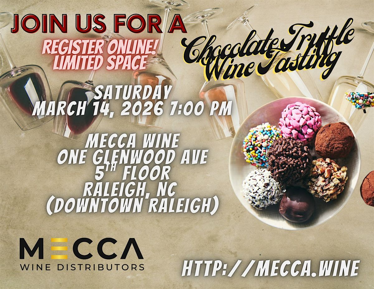 Indulge in an unforgettable night of decadence, discovery, and elevated taste. Join us on Saturday, March 14th at 7:00 PM for an exclusive Chocolate Truffle Paired Wine Tasting hosted at the stunning Mecca Wine Office, located on the 5th floor of One Glenwood Ave in downtown Raleigh.