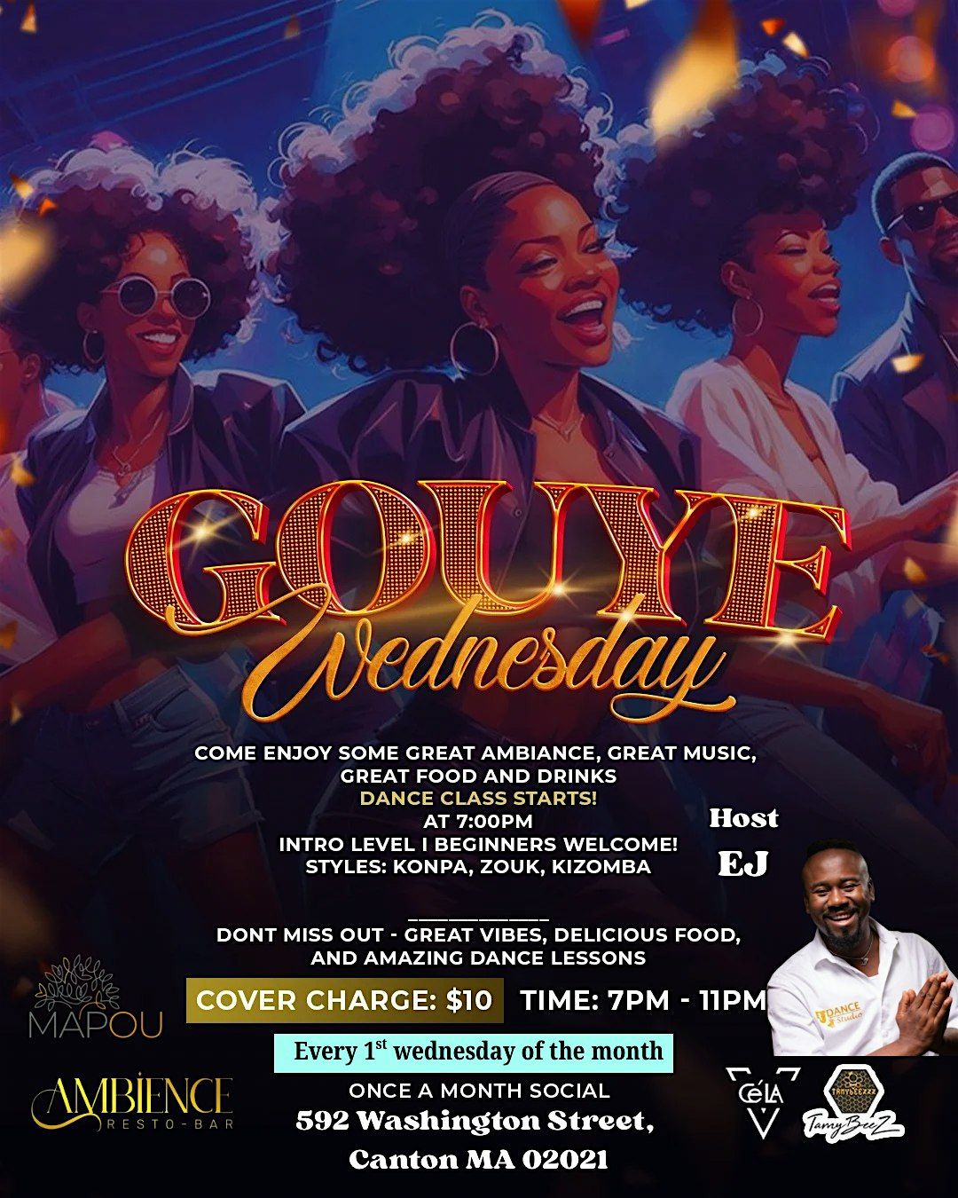 Gouye Wednesday is a soulful celebration dedicated to freedom and self-expression. Rooted in Caribbean rhythms, African drums, and ancestral vibes, it offers a vibrant space for releasing stress, dancing, and reconnecting with cultural roots. Featuring genres like zouk, konpa, tango, rumba, kizomba, reggaeton, reggae, tarraxinha, Afrobeats, and dancehall, Gouye Wednesday encourages individuals to move freely, feel alive, and embrace their authentic selves.