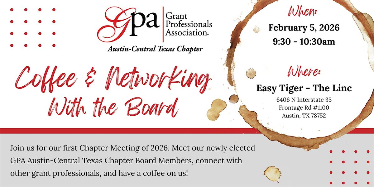 Join us on February 5 at 9:30a for coffee and connection at Easy Tiger- The Linc. GPA will provide your first coffee, and you'll have the opportunity to meet the new GPA board, learn about ways to get involved, and connect with fellow grant pros.