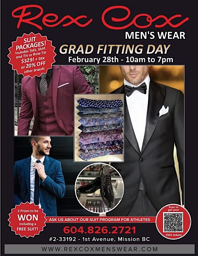Join us for another Grad day! Come down any time between 10am and 6pm and select your suit for prom! We have a fantastic grad package for you that includes a suit, shirt and tie for $329.99 +tax. If you select other items that are not part of our grad package then you still receive 20% off as well as 20% off on anything purchased outside of the grad package. Don't miss out on this fun day of getting you looking your best for Prom!