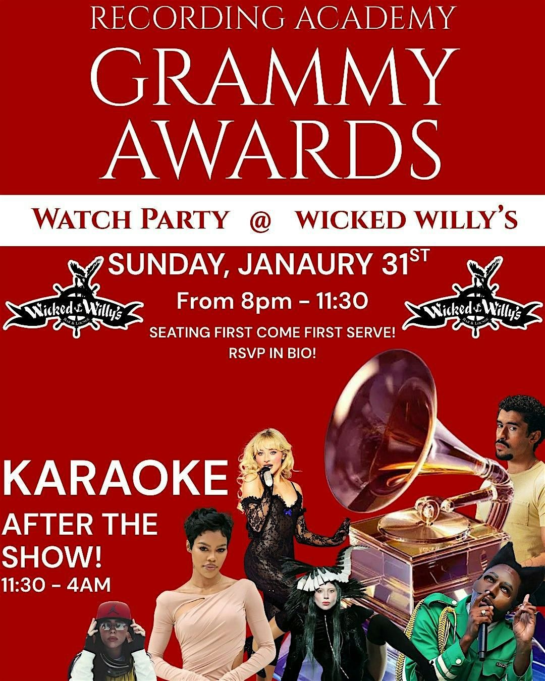 The Ultimate Grammy’s Watch Party at Wicked Willy’s! 🎤