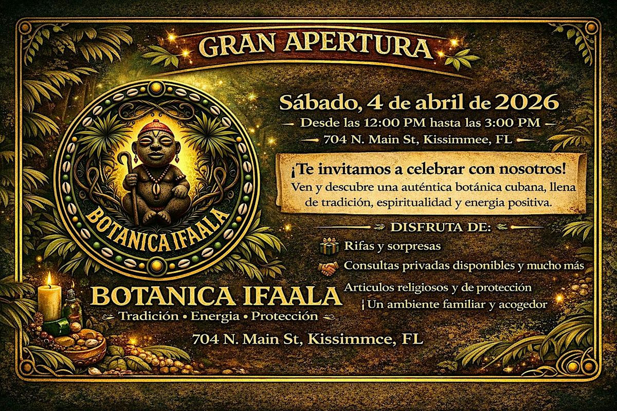 Acompáñanos este sábado 4 de abril de 2026 desde las 12:00 PM hasta las 3:00 PM en Kissimmee para celebrar la gran apertura de Botánica Ifaala, un espacio creado para brindarte herramientas espirituales, guía y bienestar.