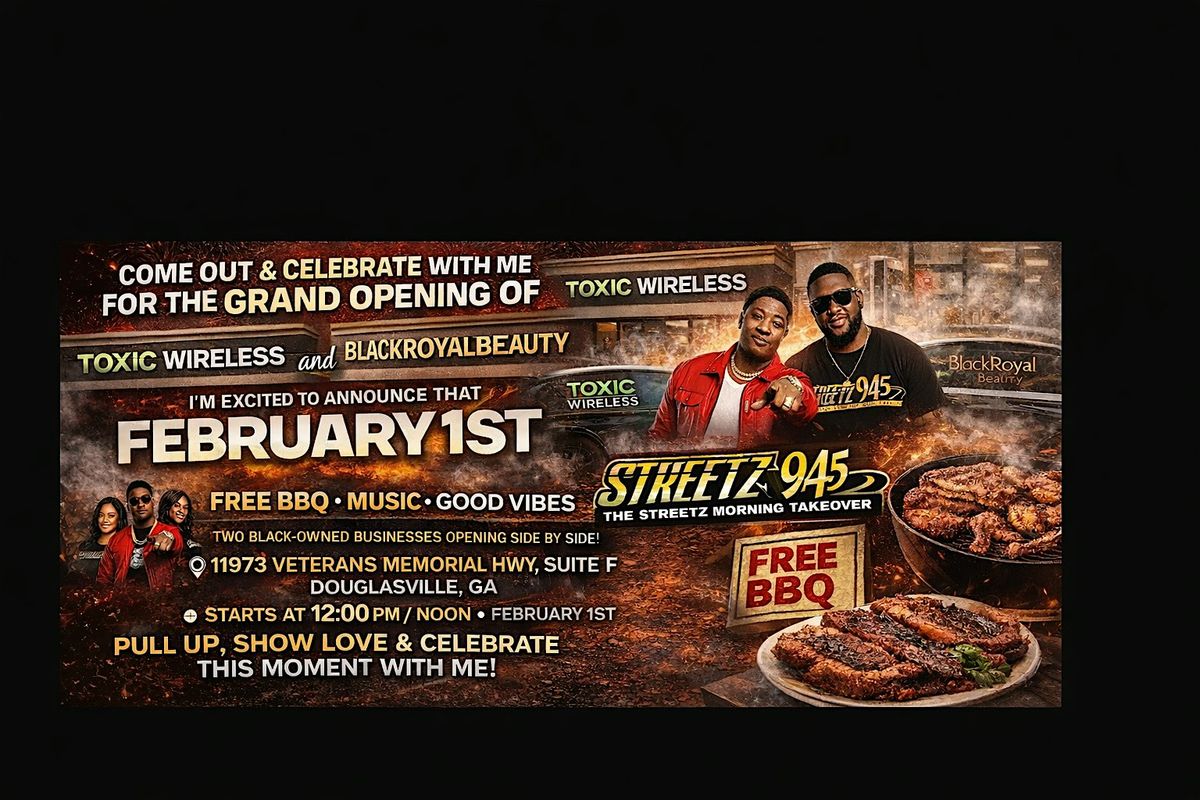 Celebrate the grand opening of Toxic Wireless and Black Royal Beauty with free BBQ, music, good vibes, and a Streetz 94.5 appearance.