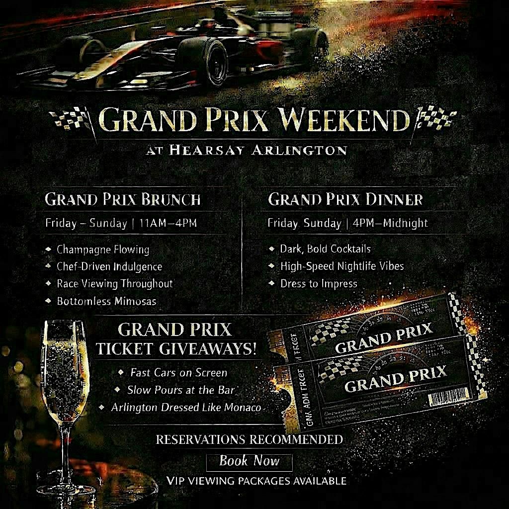 Join us in person for an unforgettable weekend filled with high-speed thrills, roaring engines, and non-stop excitement. Whether you're a racing fan or just looking for an epic day out, the Grand Prix Arlington is where the action is happening. Experience top-tier indoor views, overloking the Randol Mill straitaway, while sipping and dining. Don’t miss the chance to soak up the atmosphere, cheer on your favorite drivers, and enjoy a fantastic time with fellow motorsport lovers! Make your reservtion today for the best seat in the house, these are limited and are going FAST!