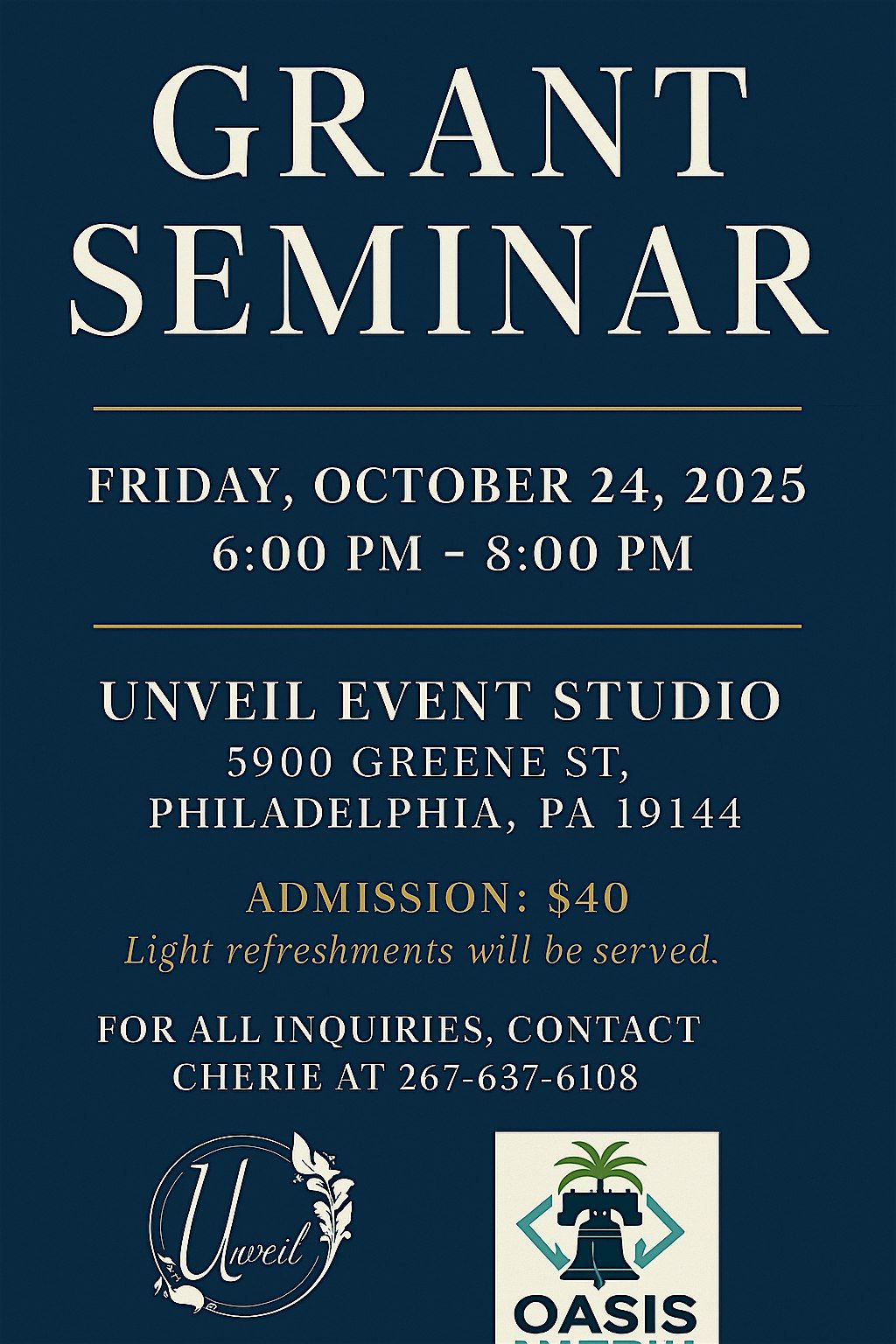Join us for an informative Grant Seminar at Unveil Event Studio. Whether you're new to grant writing or looking to enhance your skills, this event is perfect for you! Learn from experts in the field and gain valuable insights on securing funding for your projects. Don't miss this opportunity to network with like-minded individuals and take your grant writing to the next level. Reserve your spot today!