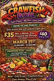 Join us for the Grapevine Elks Crawfish Boil! Serving a full barbecue buffet and 2 pounds of your choice of crawfish or shrimp. Auctions and drawings during the day. The perfect wayto kick back, chow down, and soak up some good vibes. Don't miss this tasty, fun-filled gathering!