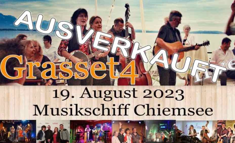 Grasset4 live auf dem Musik-Schiff am Chiemsee.Leinen los – heißt es zum bereits achten Musikschiff, organisiert von Luckymanconcerts. Vor der herrlichen Kulisse der Alpen wird vom Hafen Prien /Stock aus in See gestochen. Wer schon einmal mit dabei war, der weiß um die Stimmung an Bord. So soll es auch dieses Mal am Samstag, den 19. August wieder sein. Mit der „MS Edeltraud“, dem größten Schiff der Chiemsee Flotte gibt es drei Stunden Kreuzfahrt- Feeling auf dem Bayrischen Meer. Wer dem Kapitän zusehen will, wie ein so großes Schiff gesteuert wird, der ist auf der „Brücke“ herzlich willkommen. In den drei wetterunabhängigen Salons spielen die Bands für ihr Publikum. Hier wird für fast jeden musikalischen Geschmack etwas dabei sein - Südamerikanisches Flair und Rhythmus mit den „Los Chicos“ aus Tüßling, Rockoldies der 60er bis 80er Jahre mit „Wide Open“ aus Salzburg und fetzige Folk –und Country Musik von „Grasset4“ aus Burgkirchen. Eine gepflegte Bordgastronomie mit Grillstation inklusive bayrischen Brotzeiten gehört ebenso dazu. Auf Grund der angespannten Personalsituation im Gastrobereich wird auf Selbstbedienung umgestellt. Jeder Gast erwirbt beim Kauf einer Eintrittskarte einen unnummerierten Tischsitzplatz.