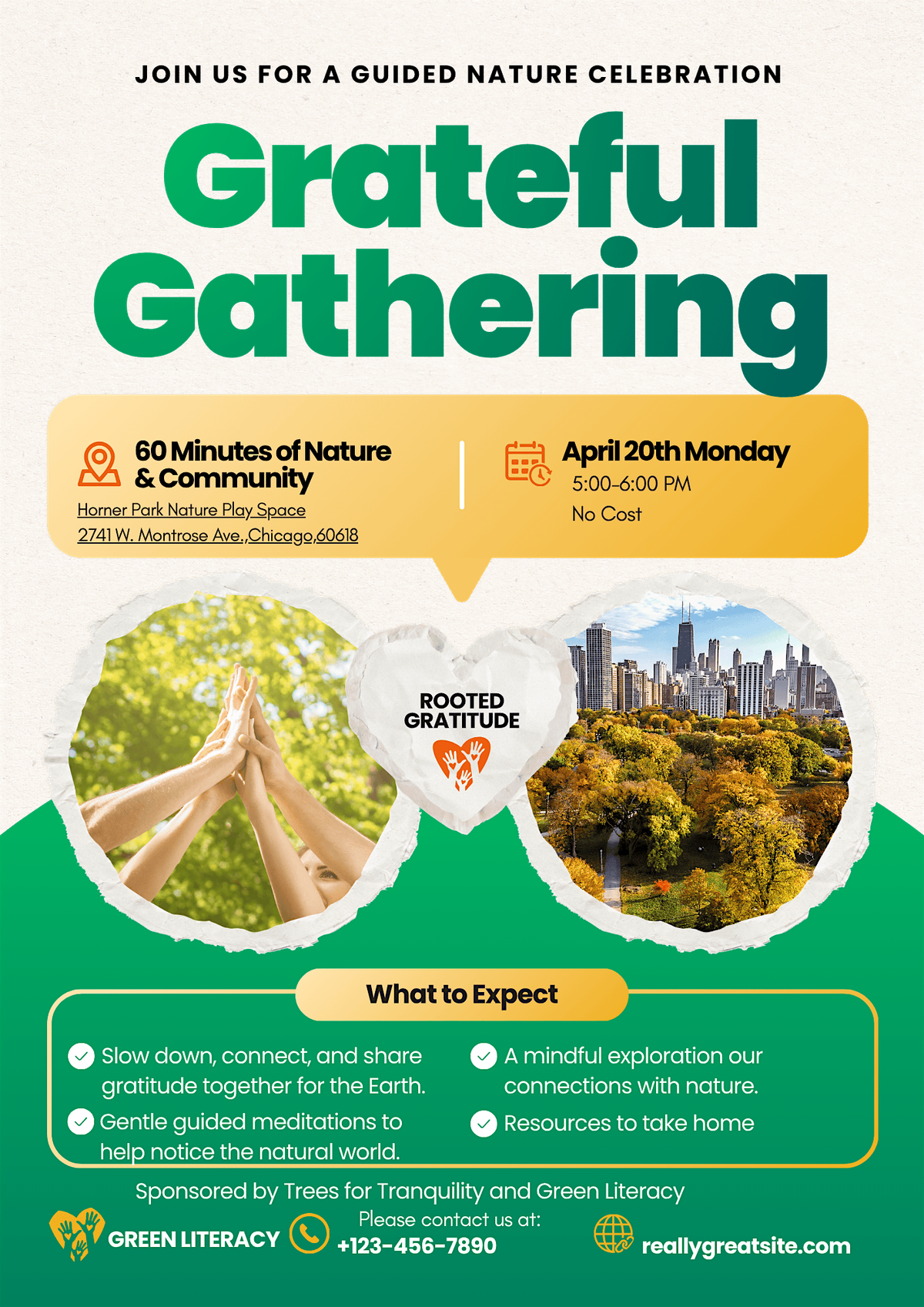 Join us for a Gratitude Gathering for the Earth. This is a free, no-cost community event focused on connection, guided meditation, and exploring nature together. This gathering is led by a forest‑guide practitioner from Trees & Tranquilty and an environmental educator of GreenLiteracy.org, both professionals will offer simple practices to help you slow down and engage with the natural world.