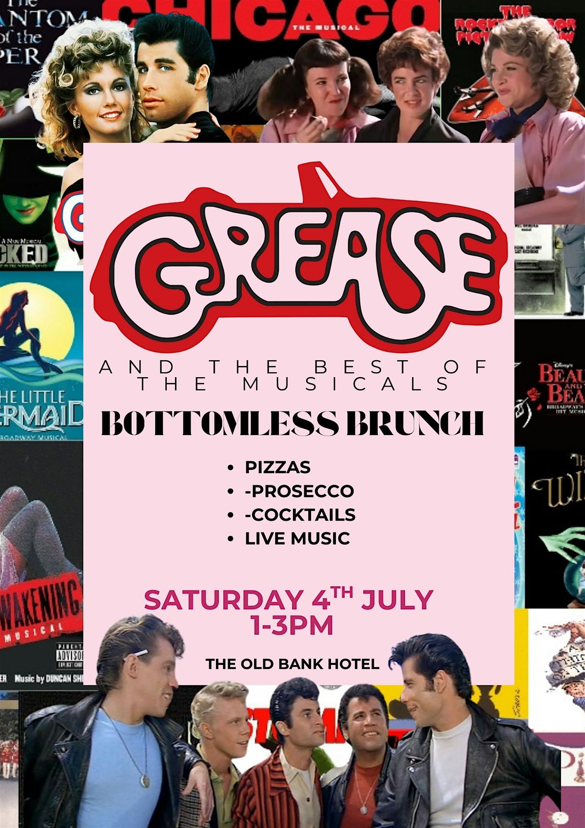 It’s time to take your seats… and your slices! Our Grease & Best of the Musicals Bottomless Brunch is rolling out the red carpet for a Saturday packed with iconic tunes, fabulous flavours, and all the feel‑good nostalgia you can handle.Join us for an afternoon where Broadway meets brunch, featuring: Unlimited pizzas Bottomless prosecco & cocktails Live performances celebrating the greatest musicals of all time A soundtrack that’ll have you singing along from the first sip Saturday 4th July 1–3pm The Old Bank Hotel£39.99 per person, payable upon booking.Whether you’re a Grease superfan, a Wicked devotee, or a lover of all things musical, this is your moment to shine. Grab your friends, warm up those vocal cords, and get ready for a brunch that hits every high note.