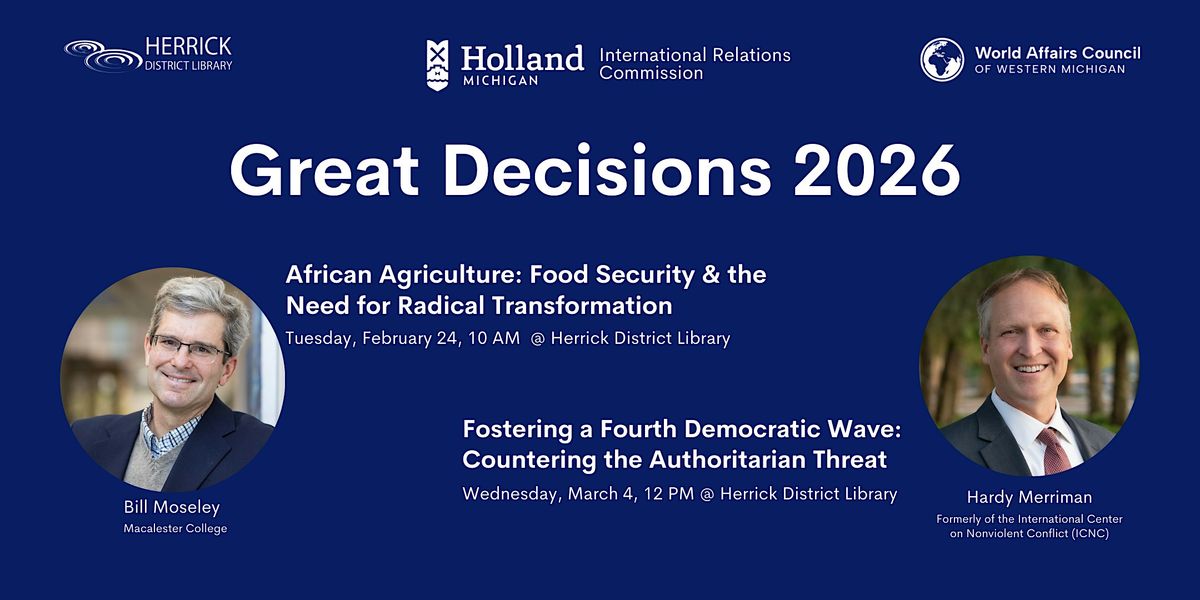 The City of Holland’s International Relations Commission (IRC) will host international affairs experts Bill Moseley and Hardy Merriman as part of Great Decisions 2026, America’s largest annual discussion program on world affairs. Both presentations will be held at the Herrick District Library and are free and open to the public.