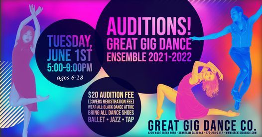 A $20 Audition fee is due and will be applied to your Registration at Great Gig Dance Co. (no fee if you’ve already registered for the 2021-2022 dance season).
