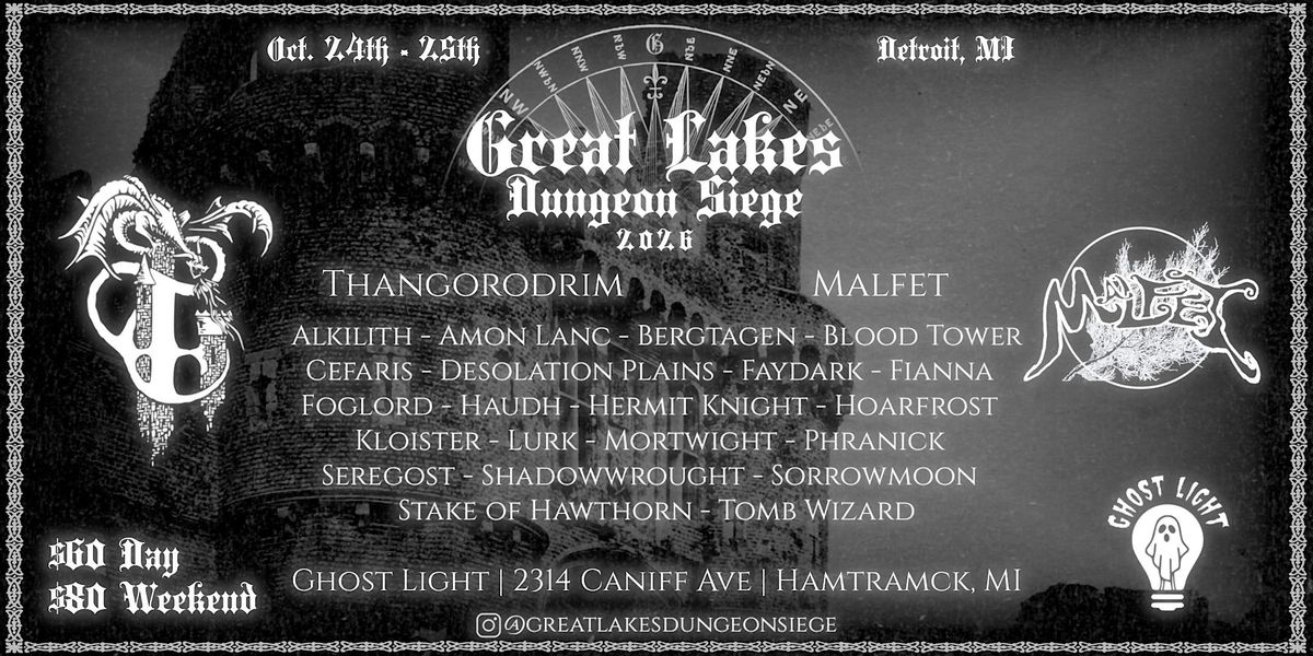 Great Lakes Dungeon Siege returns for its third iteration. Now in its second year in Detroit, GLDS continues to boast an eclectic lineup of both dungeon synth and related heavy hitters and obscure artists. From Thangorodrim’s dark, heavy dungeon synth to Malfet’s emotive, fantastical synthesizer music and Sorrowmoon’s atmospheric dungeon metal, Great Lakes Dungeon Siege 2026 will deliver a Siege for the ages!
