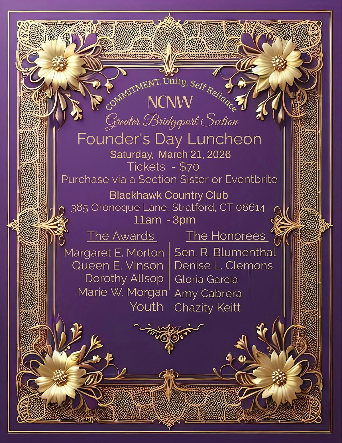 U.S. Senator Richard Blumenthal - Margaret E. Morton Civic Award; Denise L. Clemons - Queen E. Vinson Section Award; Gloria Garcia (Thelma's Soul Food Restaurant & Bar) - Dorothy Allsop Entrepreneur Award; Amy Cabrera - Marie W. Morgan Community Service Award and Chazity Keitt - Youth Award.