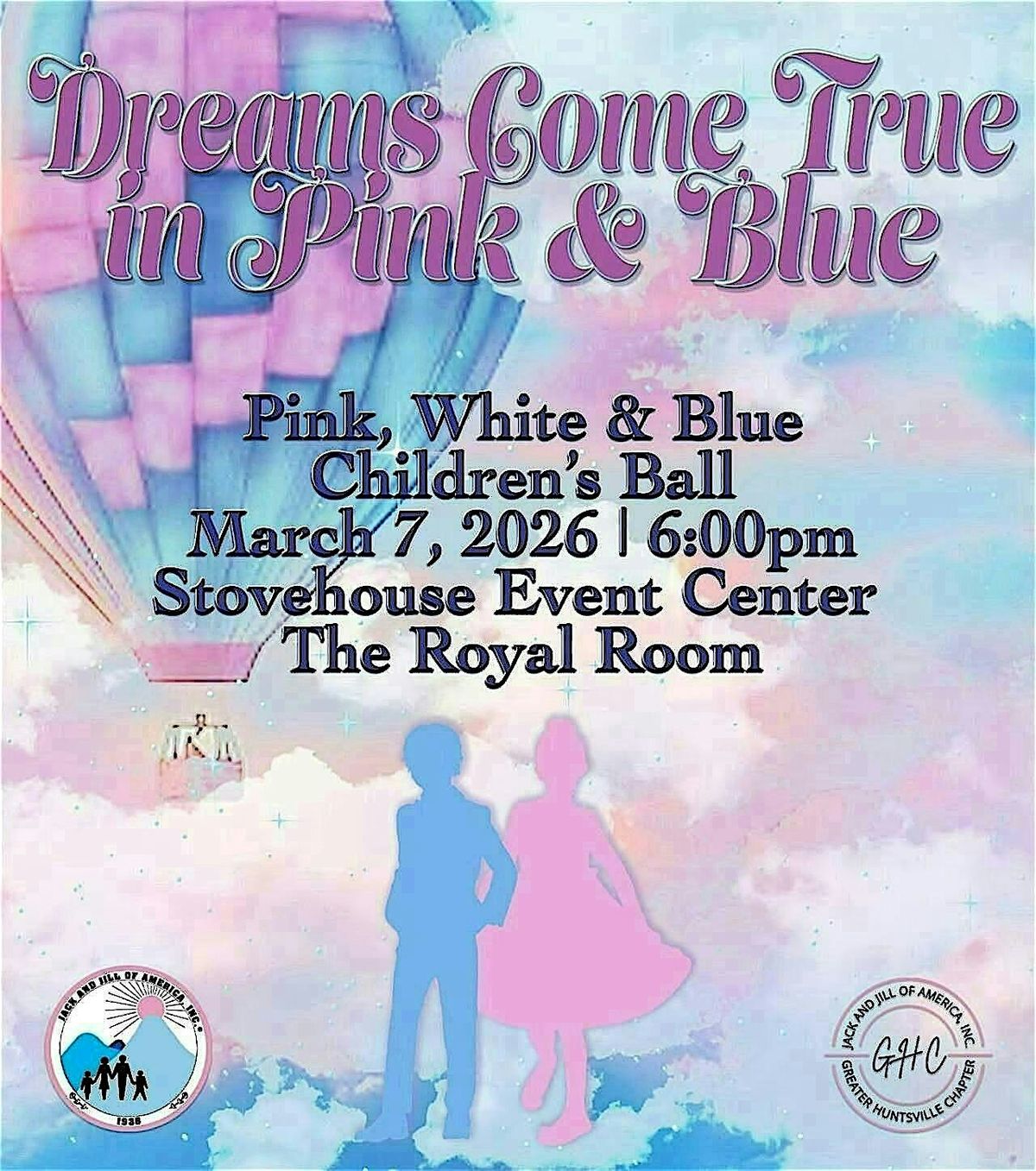 On Saturday, March 7, 2026, the Greater Huntsville Chapter of Jack and Jill of America, Incorporated will host its signature Pink, White & Blue Children’s Ball at the Stovehouse Event Center in the Royal room. This year’s theme, “Dreams Come True in Pink and Blue,” celebrates hope, imagination, and the limitless potential of our youth.