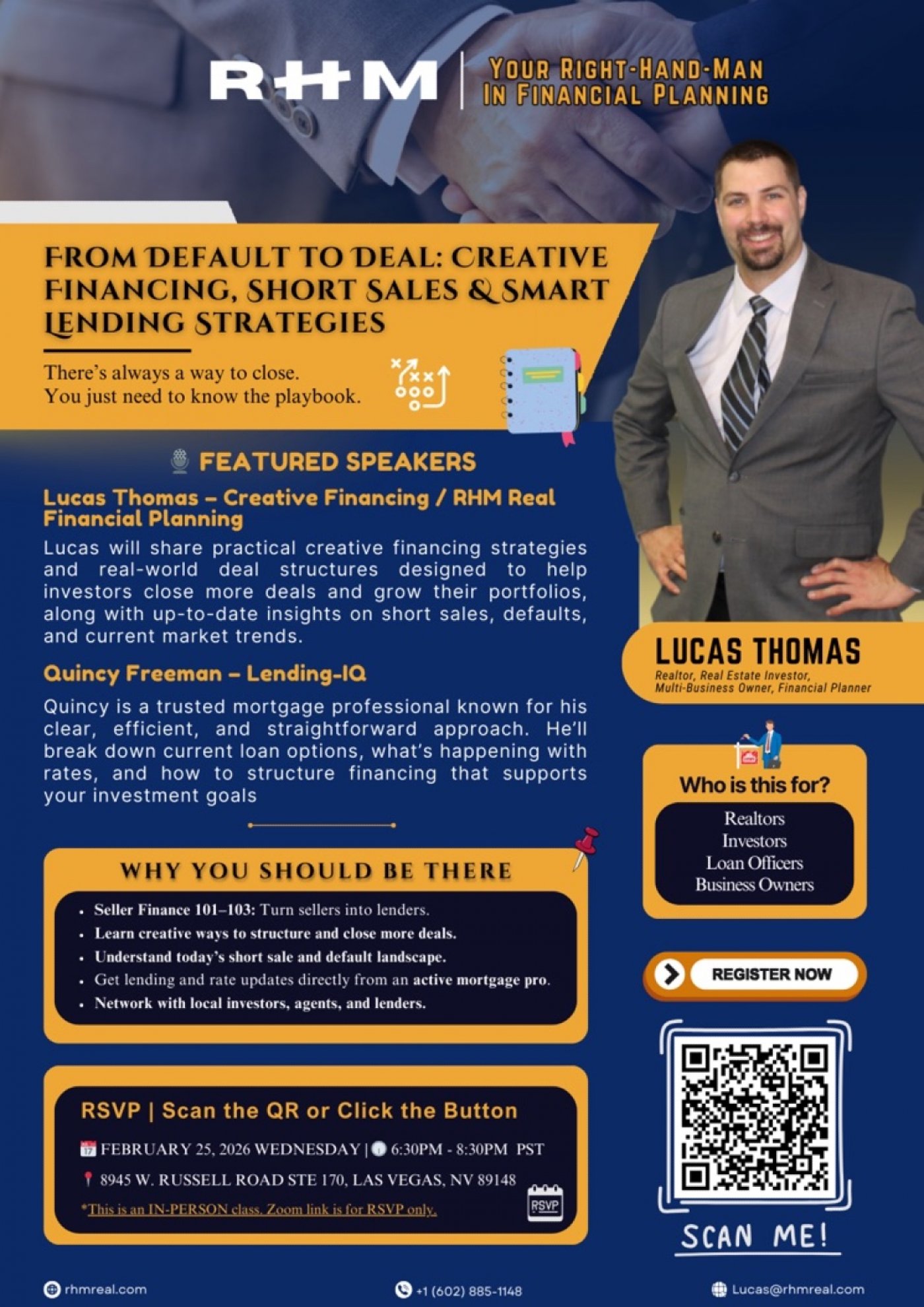 Lucas will share practical creative financing strategies and real-world deal structures designed to help investors close more deals and grow their portfolios, along with up-to-date insights on short sales, defaults, and current market trends.