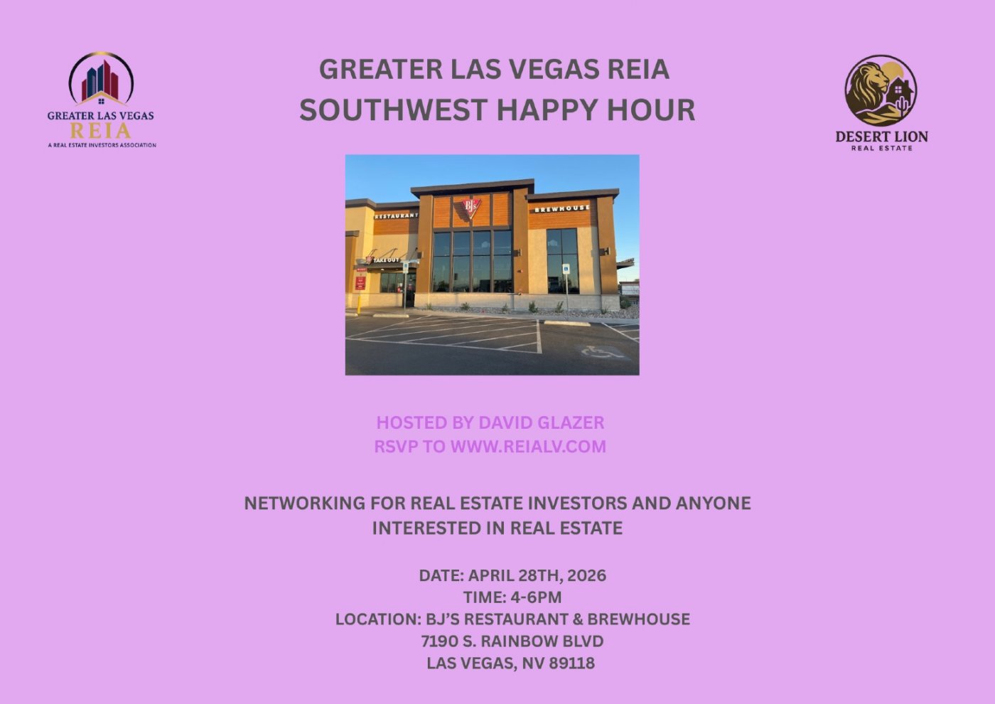 Don't miss our SW happy hour where you will relax and network with real estate professionals and business associates as well. You will learn and talk about real estate investing in Las Vegas and discuss opportunities on finding deals. Come enjoy having some food and beverages with us in a relaxed atmosphere. This is a monthly event every 4th Tuesday.