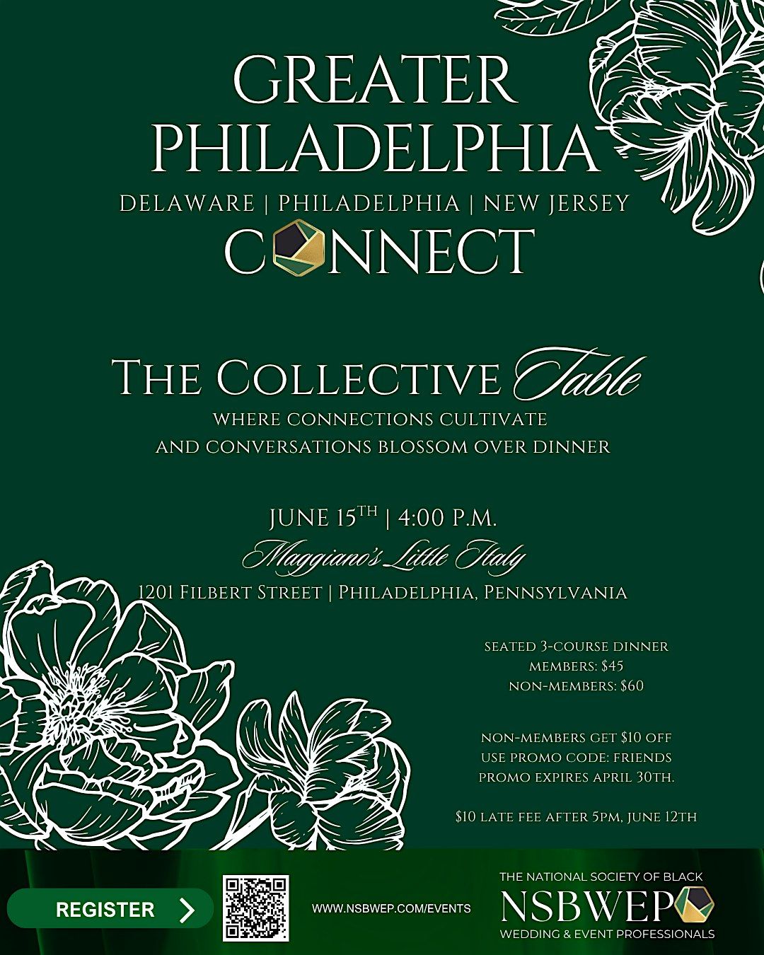 Greater Philadelphia Area Industry Pros, join The National Society of Black Wedding and Event Professionals (NSBWEP) on June 15th for an unforgettable evening at The Collective Table—a curated networking dinner designed to inspire, connect, and empower. Set against the backdrop of a beautifully plated family-style three-course meal, this experience brings together Black professionals and their allies in the wedding and event industry for intentional, table-side conversations that spark collaboration and elevate our collective impact. Guests will engage in strategic dialogue, build meaningful relationships, and learn more about the mission and vision of NSBWEP. This is more than a dinner—it’s a movement rooted in culture, community, and the power of shared purpose.