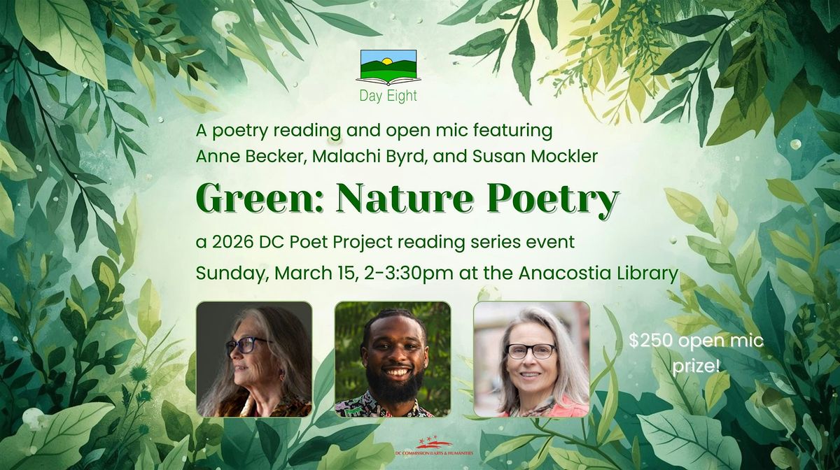 This is the third event in Day Eight’s 2026 DC Poet Project reading series and competition. Each event includes about thirty minutes of poetry by the featured poets and equal time for reading by open mic participants. A $250 open mic prize, selected by the featured poets, is awarded at the end of each reading.