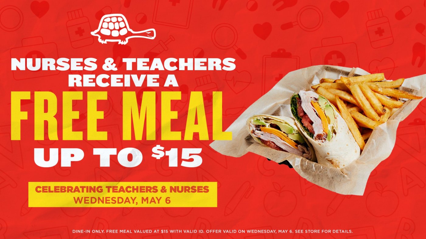 To celebrate National Teacher & Nurses Week, The Greene Turtle is honoring nurses and teachers with a FREE meal on Wednesday, May 6! This offer is valid for dine-in guests only with a valid ID, up to a $15 value. Itβs a small gesture to show big appreciation for those who give so much every day. π