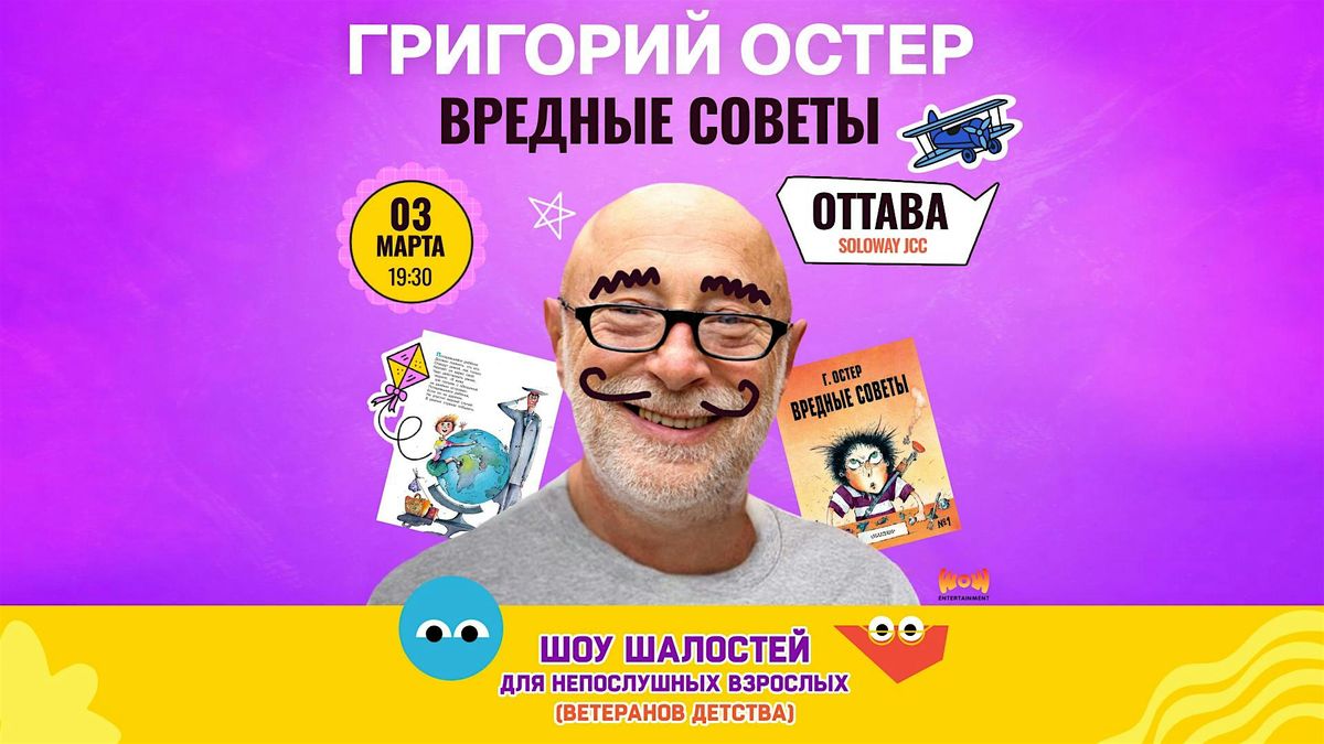 На ШОУ ШАЛОСТЕЙ Григория Остера “Вредные Советы для непослушных взрослых, которые остались детьми”, собираемся 3 Марта в Soloway JCC.