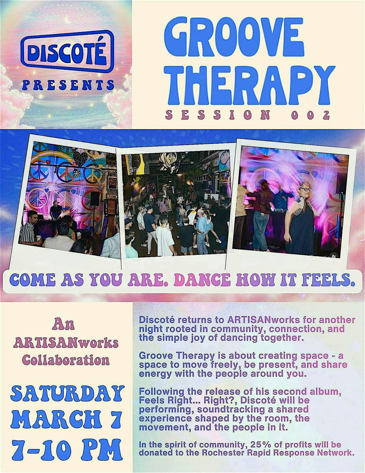 Info: Kick off the night with a relaxed social hour — time to explore ARTISANworks, take in the artwork throughout the space, and connect with others in the community. Discoté and Groove Therapy merch will be available, along with beer, wine, cocktails, and light snacks for purchase.