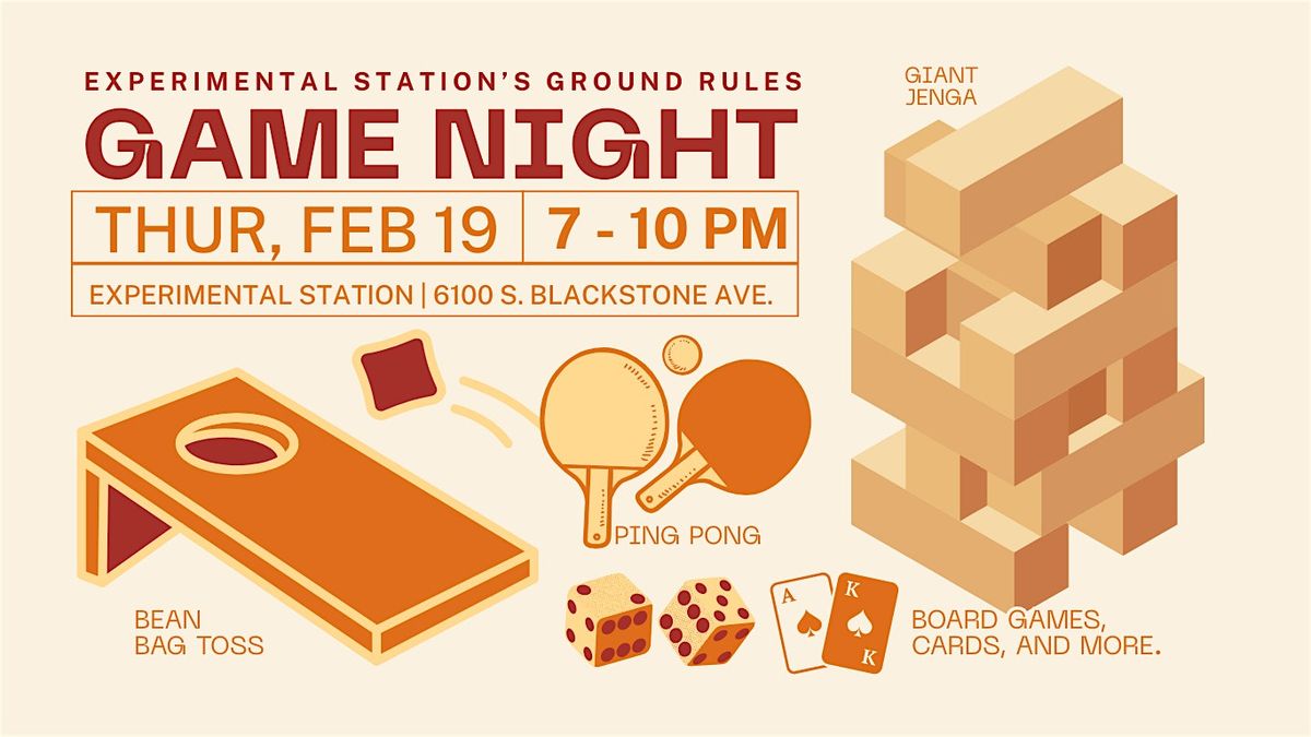 Ground Rules: Game Night is a free, family-friendly evening of play, friendly competition, and community connection at Experimental Station. Join us throughout the year to unwind, have fun, and connect with neighbors through shared games and conversation.