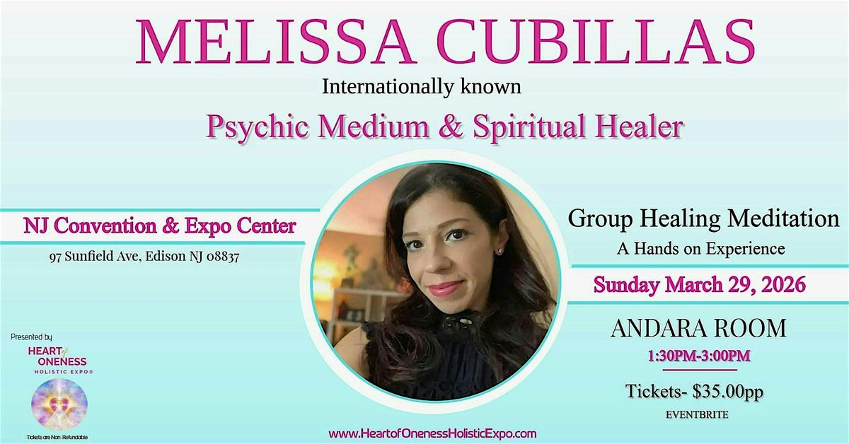 Join Psychic medium Melissa Cubillas and her certified spiritual healers for this very special event, exclusively at The Heart Of Oneness Healing Expo. This healing and meditation gathering is an immersive experience where participants are encouraged to fully relax and let go past traumas, and of daily stress of life. Melissa will lead the group in a live guided meditation, creating a calm, focused atmosphere. Certified healers will circulate the room, offering gentle, optional hands-on healing intended to release tension, balance energy, and encourage emotional and physical restoration. The event combines intention setting, sound, healing energy, and meditative practice to harmonize the mind, body, and spirit. By the end of the session, participants can expect to feel lighter, more centered, and connected to a sense of inner clarity and peace. NO prior experience is required or necessary to attend this event. Please note due to the popularity of Melissa's past events, In order to secure your tickets we highly recommended purchasing them in advance online. Once ticket sales end online, there will be a very limited amount of tickets reserved for purchase at the door.
