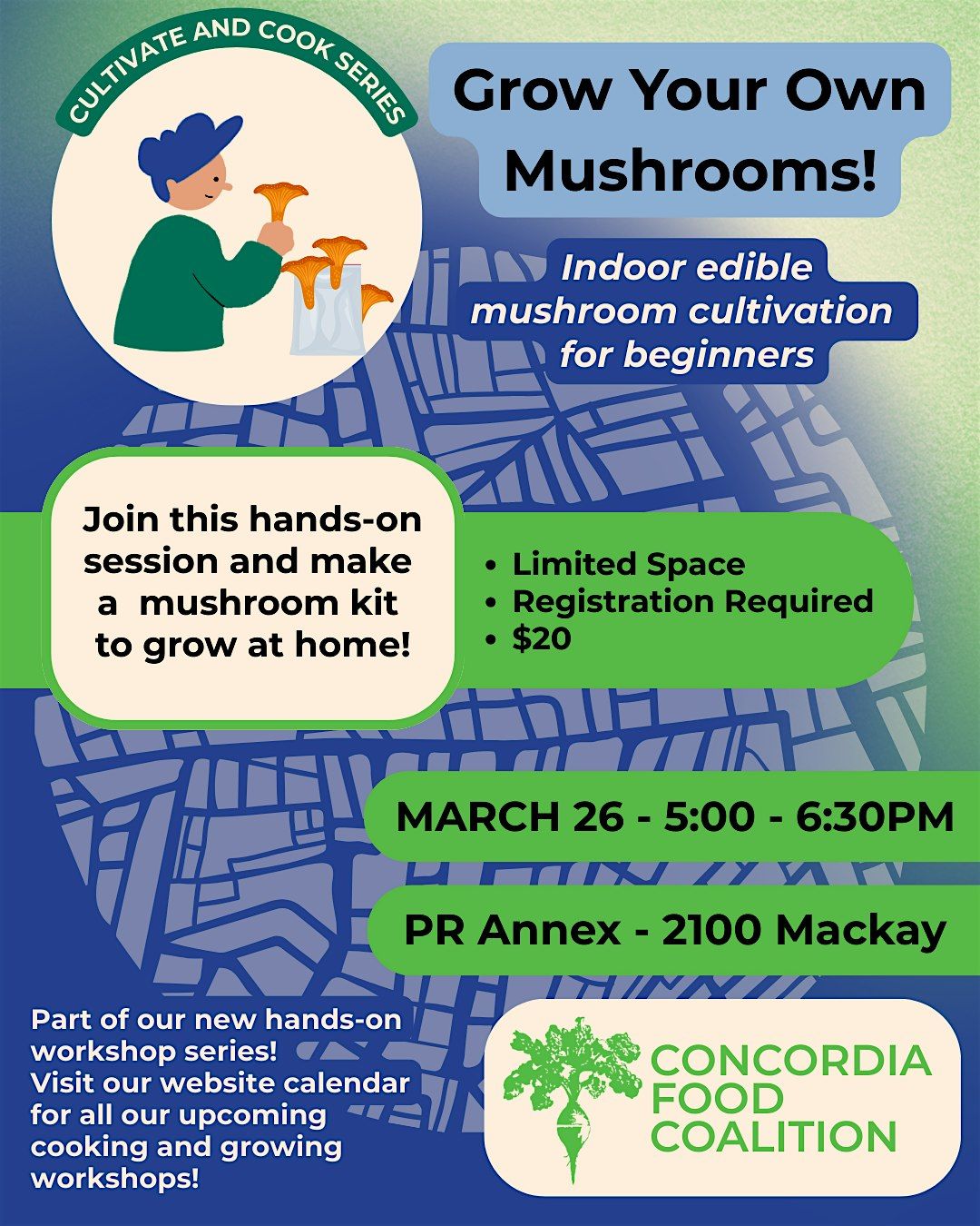 For just $20, you’ll get guided instruction and a mushroom grow kit to take home, so the learning (and growing) continues after the workshop.