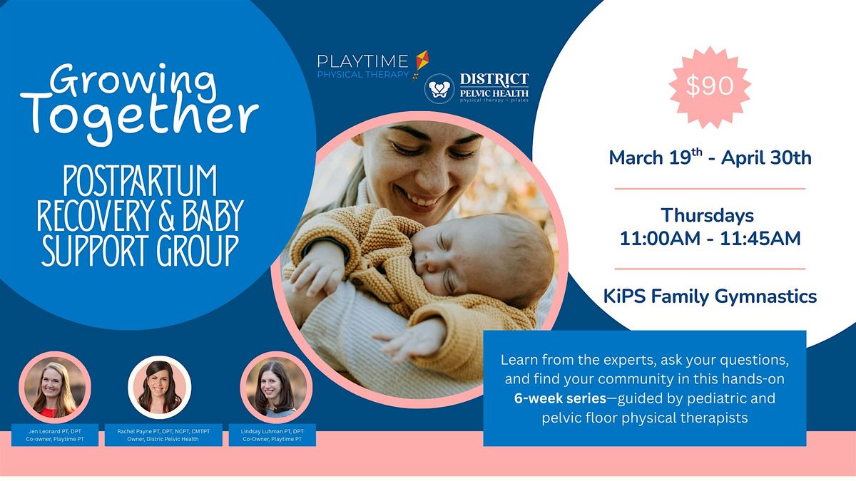 Postpartum recovery isn’t meant to be done alone — and neither is learning how to support your baby’s development. Growing Together is a 6-week guided support series led by the expert physical therapists at District Pelvic Health and Playtime PT, created to support both you and your baby during the early months after birth.