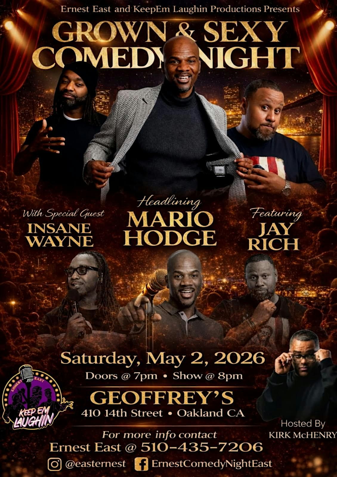 Ernest East & Keepem Laughin is back...Get ready for a night full of laughs and good vibes at Grown & Sexy Comedy Night! This in-person event is all about bringing the funniest, realest comedy to a crowd that knows how to have a great time. Kick back, enjoy the jokes, and connect with other cool folks looking to unwind and laugh their stress away. Don’t miss out on an evening packed with humor, charm, and a little bit of that grown and sexy swag!