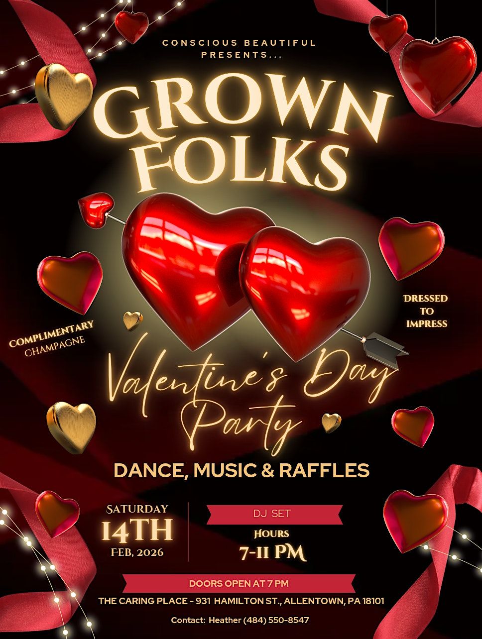 Get ready for a fun night out with the Grown Folks Valentine's Day Party! This in-person event is all about good vibes, great company, and celebrating love in style. Whether you're single, coupled up, or just looking to have a blast, this party's got you covered. Dress to impress and come ready to mingle, dance, and make unforgettable memories!