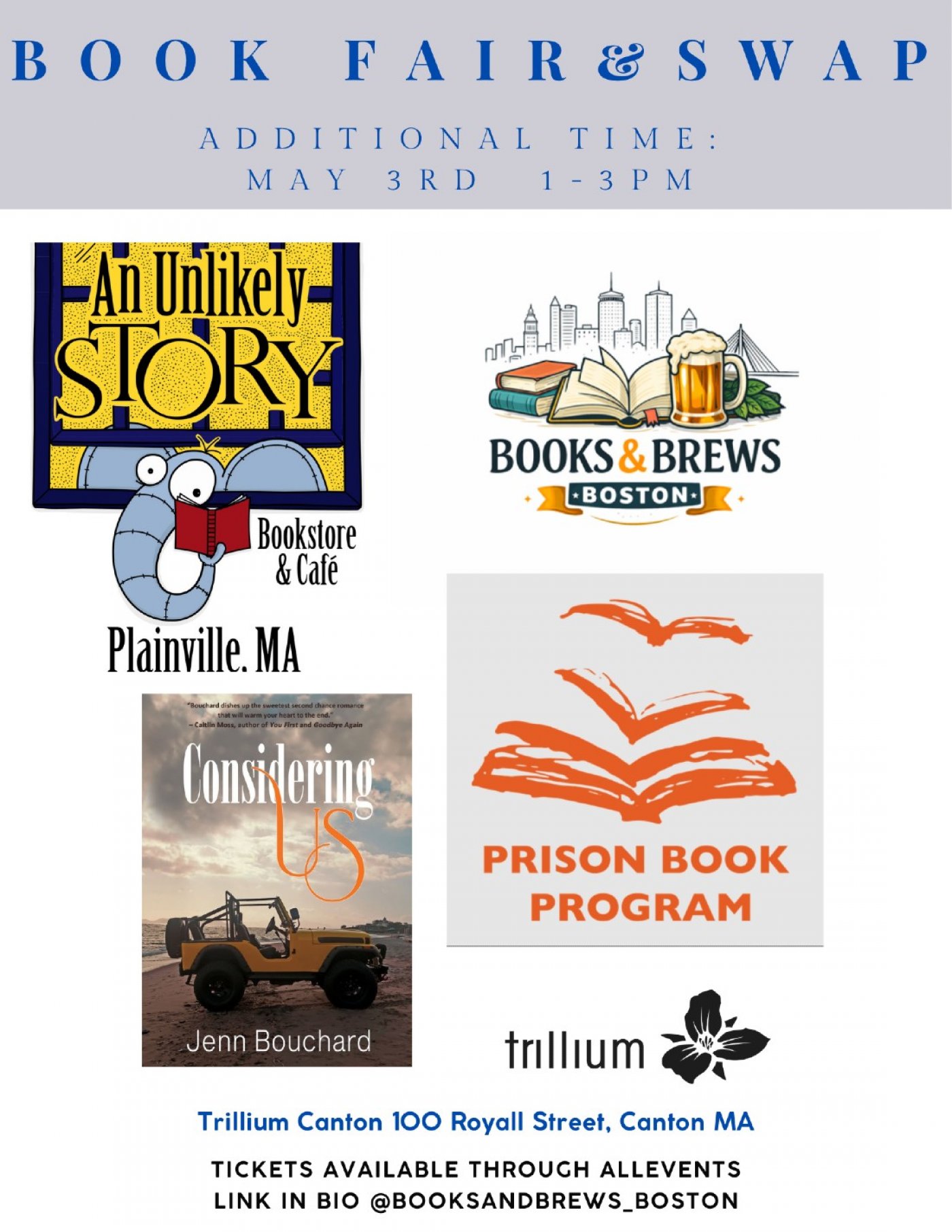 Books and Brews Boston and An Unlikely Story are teaming up again for a grown-up book fair and swap at Trillium's Canton location! Just like last time bring a gently used book (or books) to swap, sip on one of Trillium's amazing beverages, and shop new books and merch from An Unlikely Story (the coolest bookstore). We will also have local author, Jenn Bouchard, there selling her entertaining coastal rom coms. Any remaining books at the end of the swap will be donated to the Prison Book Program (check them out- they do incredible work!). Can't wait to see you!