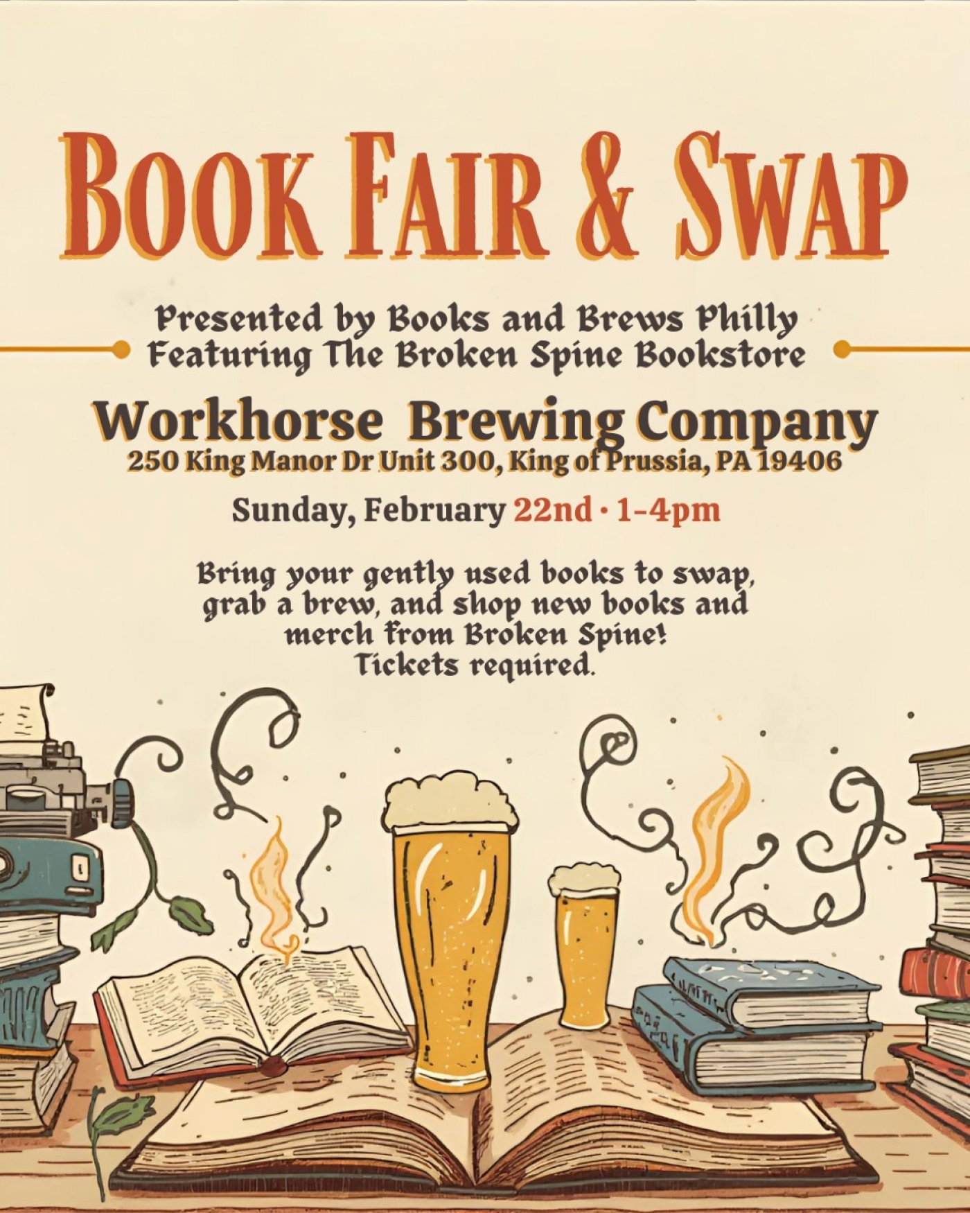 Books and Brews Philly is back at Workhorse Brewing and this time, we are teaming up with our friends at The Broken Spine Bookstore to bring you a a book lover's dream event...a grown-up book fair and swap! Bring a gently used book(s) to swap, grab a brew and shop new books and merch from The Broken Spine! This event is 21+.
