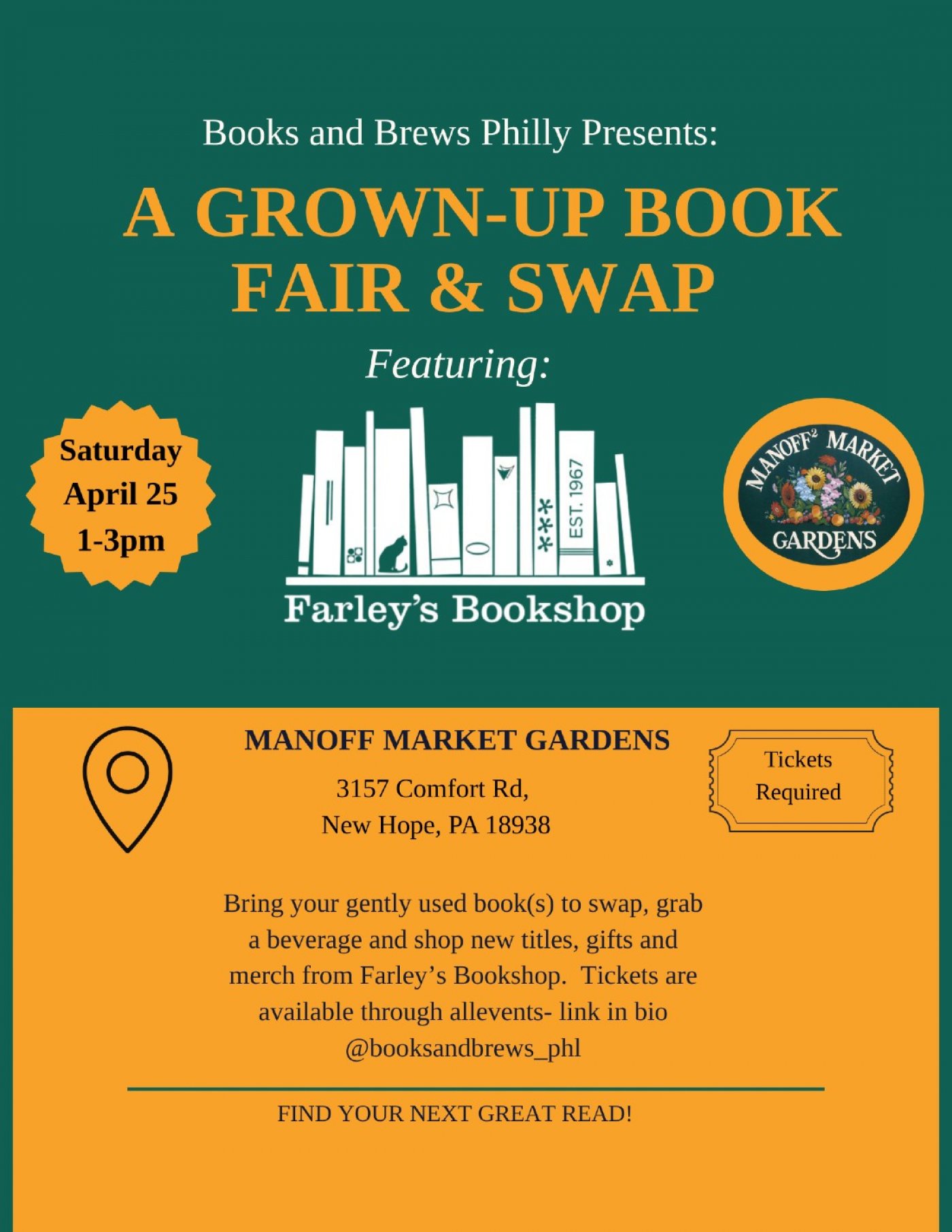 Books and Brews Philly and Farley's Bookshop are teaming up once again...this time at a cidery!! Join us on Saturday, April 25th from 1-3pm for a grown up book fair and swap! Bring a gently used book(s) to swap, sip a cider, and shop new books, gifts and merch from Farley's!