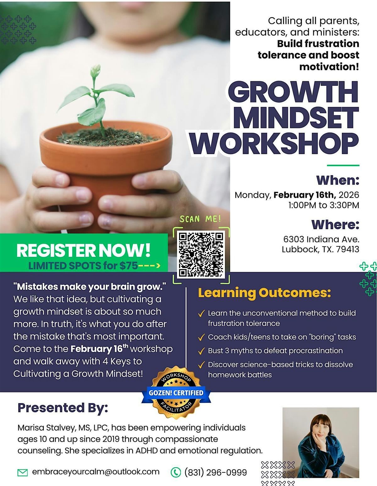 Date & Time: Monday, February 16, 2026 | 1:00 PM – 3:30 PM (2.5-hour intensive with a short break) Location: 6303 Indiana Ave., Lubbock, TX 79413 . Pre-Regitration required!