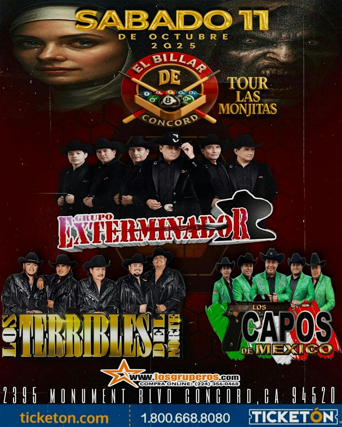 Join us at EL BILLAR DE CONCORD on October 11, 2025 at 8:00 PM for a phenomenal show featuring GRUPO EXTERMINADOR, LOS CAPOS DE MEXICO, and LOS TERRIBLES DEL NORTE. Get ready to dance, sing, and have an amazing time with these legendary bands!