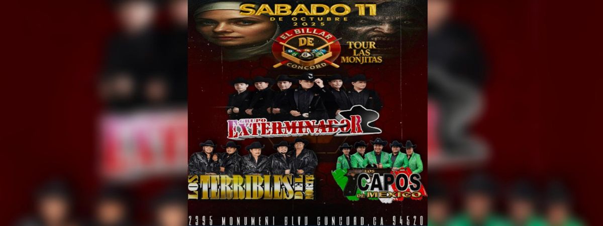 Join us for 'GRUPO EXTERMINADOR, LOS TERRIBLES DEL NORTE & MAS', a groundbreaking exciting event at El Billar de Concord, Concord, CA, United States. This event is a cornerstone of innovation in the industry. Engage with experts, explore new horizons, and elevate your understanding of the exciting landscape. Register now to secure your spot at this landmark event. #GRUPOEXTERMINADOR,LOSTERRIBLESDELNORTE&MAS #event #exciting #ConcordEvents #CAEvents