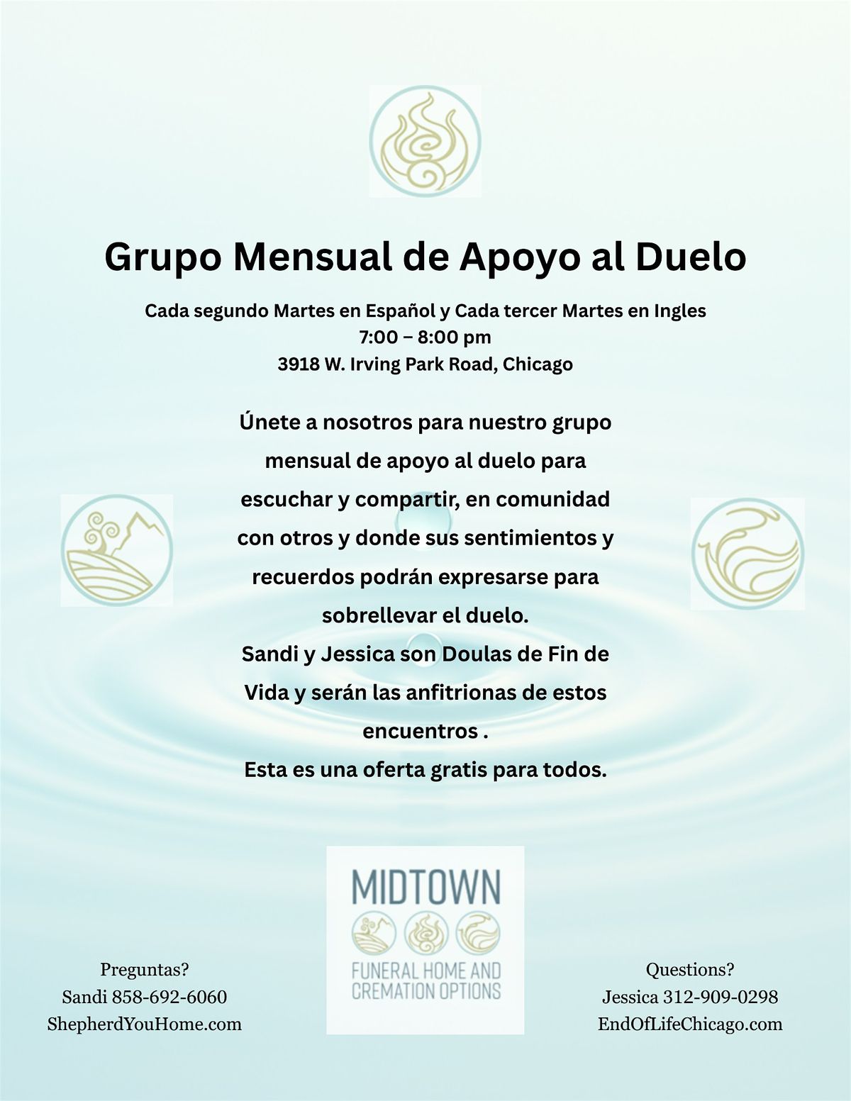 - Cada segundo Martes en Español y cada tercer Martes en Ingles de 7:00 – 8:00 pm en Midtown Funeral Home 3918 West Irving Park Road, Chicago
