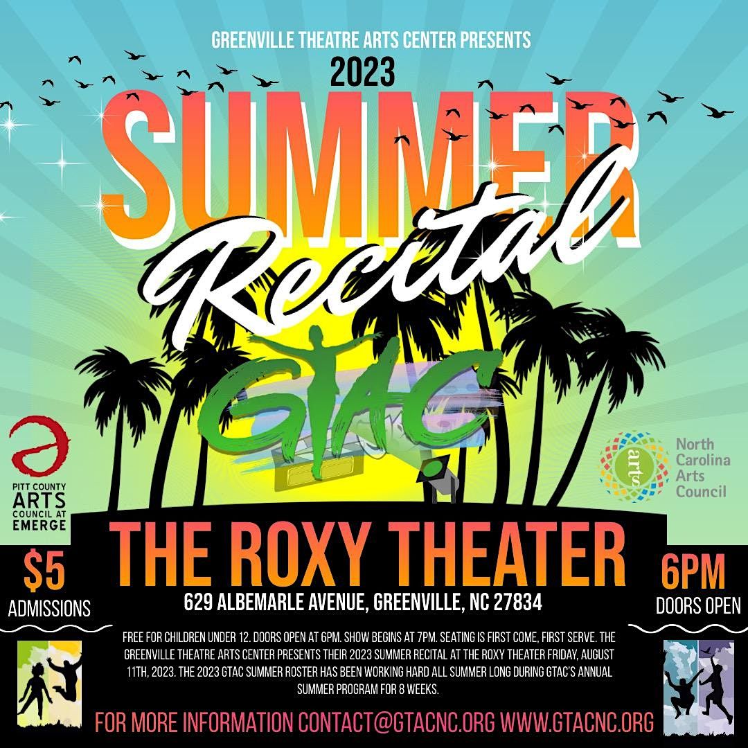 The Greenville Theatre Arts Center presents their 2023 Summer Recital at the Roxy Theater Friday, August 11th, 2023. Doors open at 6pm and show begins at 7pm. The 2023 GTAC Summer Roster has been working hard all Summer long during GTAC’s Annual Summer Program for 8 weeks. Support our organization by visiting our website at www.gtacnc.org and learning more information.