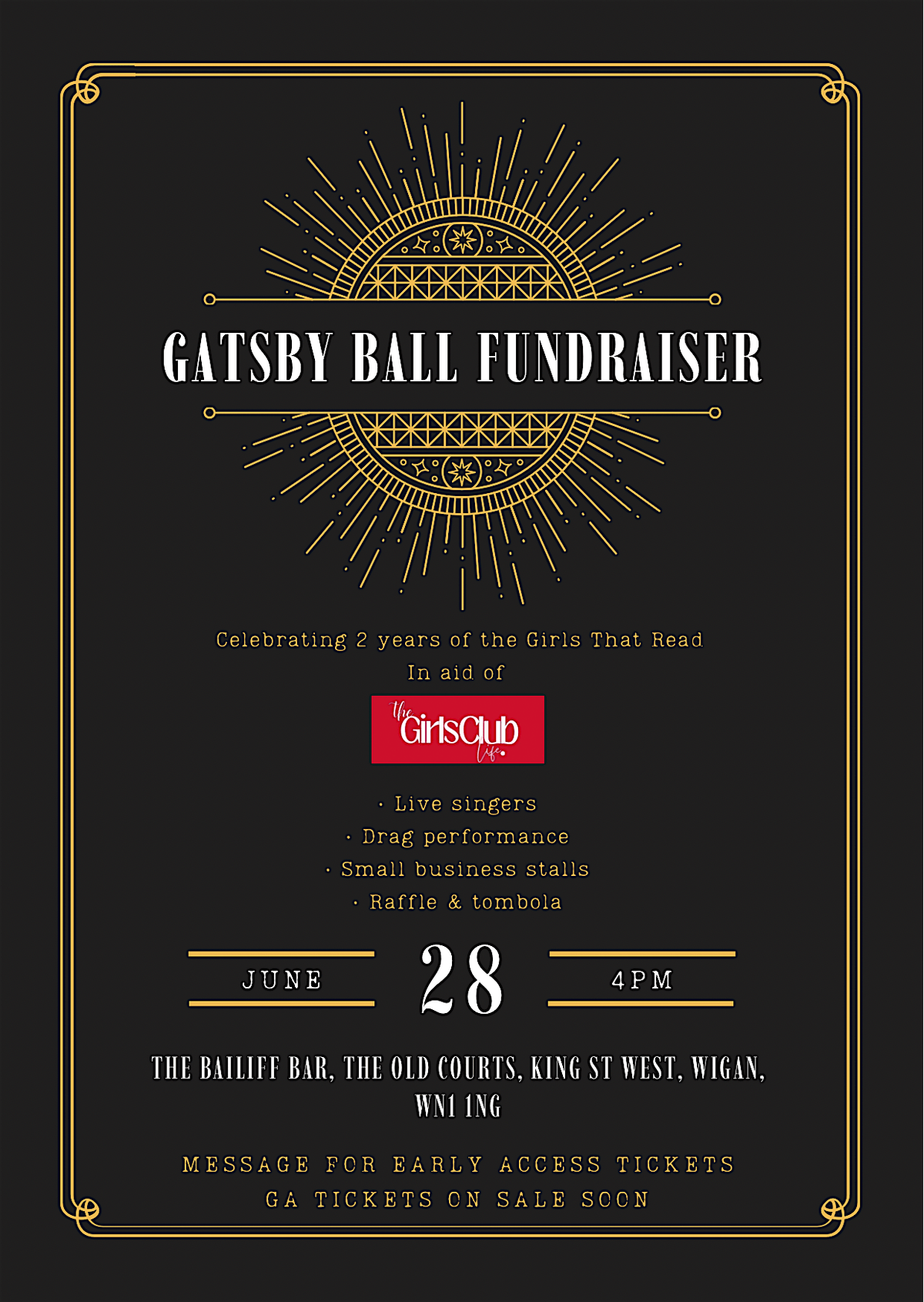 Join us at the Bailiff Bar for an unforgettable night at the GTR Gatsby Ball Fundraiser! Celebrate Girls That Reads 2nd Birthday and help raise money for the amazing Girls Club CIC.