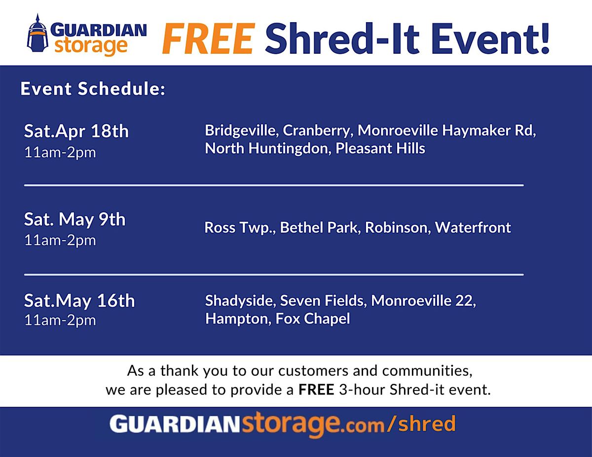 As a thank you to our customers and community, Guardian Storage is hosting a series of FREE Shred-It events throughout our Pittsburgh locations. These events provide a safe way to dispose of unwanted files, papers, and documents free of charge and no purchase or commitment of any kind. The only request is that a voluntary monetary donation or unopened school supplies be brought to the event to support The Education Partnership. Please limit paper waste to the equivalent of five file boxes’ worth and remove file clips before arrival.