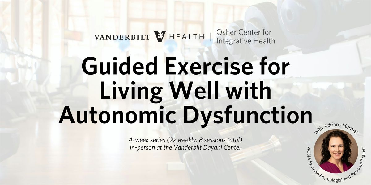 This group-based exercise class is designed for those living with autonomic dysfunction (such as POTS) and those with chronic conditions who experience difficulty exercising. Our goal is to help you enhance your physical function, cardiovascular health, and overall wellβbeing through guided, personalized exercises tailored to your individual level. Sessions will be held in-person at a gym located within the Vanderbilt Dayani Center and will incorporate strength-training equipment, a walking track, cardio machines, functional movement, as well as check-ins with the class facilitator to discuss individualized strategies to support exercise adherence. This class is presented by the Osher Center for Integrative Health at Vanderbilt and facilitated by Adriana Hermel, Certified ACSM/ACS Cancer Exercise Trainer, ACSM Exercise Physiologist and Personal Trainer, Health & Wellness Coach, and Certified Yoga Therapist.