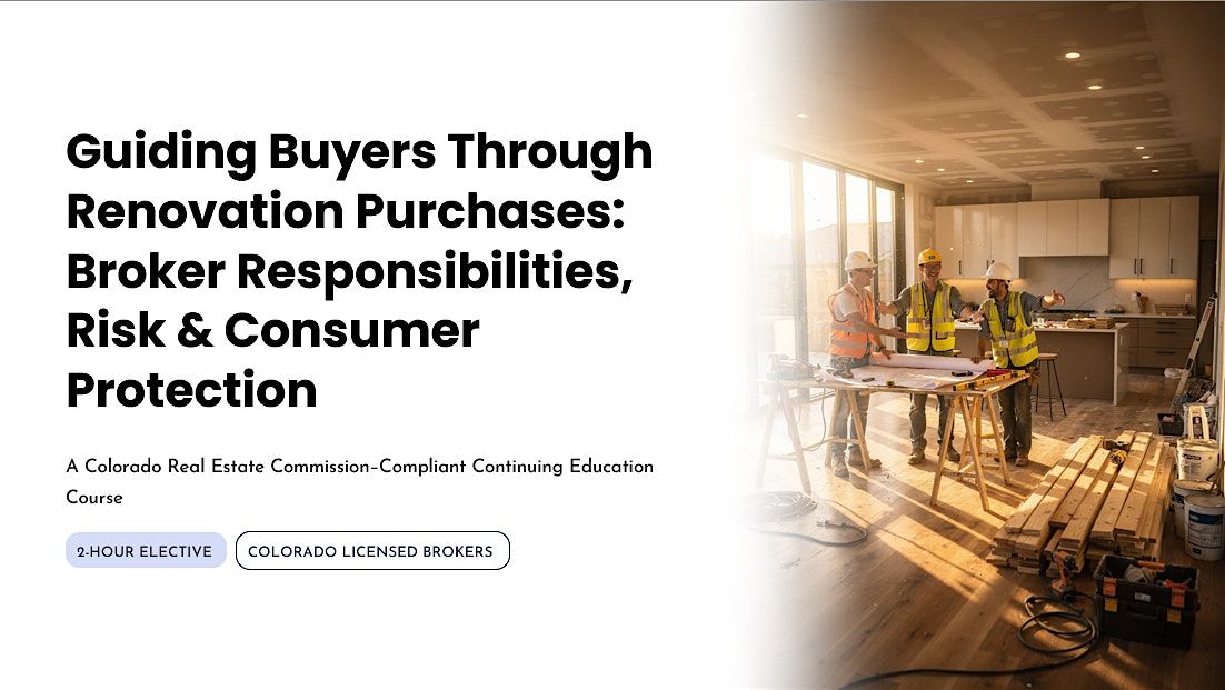 Navigate the complexities of renovation-driven real estate transactions with “Guiding Buyers Through Renovation Purchases: Broker Responsibilities, Risk & Consumer Protection”, a Colorado Real Estate Commission–compliant continuing education course for licensed brokers. This 2-hour elective equips you with the knowledge and strategies to protect your clients, manage risk, and maintain professional boundaries throughout the renovation purchase process.
