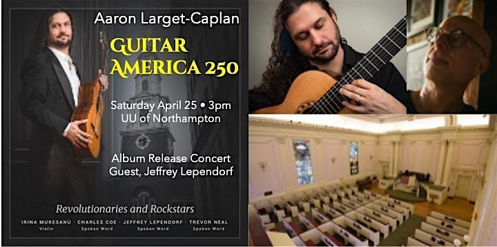 Join acclaimed guitarist and composer Aaron Larget-Caplan for the release concert of Guitar America 250, a sweeping musical tribute to 250 years of American creativity and courage. Taking place Saturday, April 25 at 3pm in the beautiful Unitarian Society of Northampton and Florence, this one-hour program traces the nation’s evolving voice through music of revolutionaries, abolitionists, suffragists, immigrants, and rock legends.