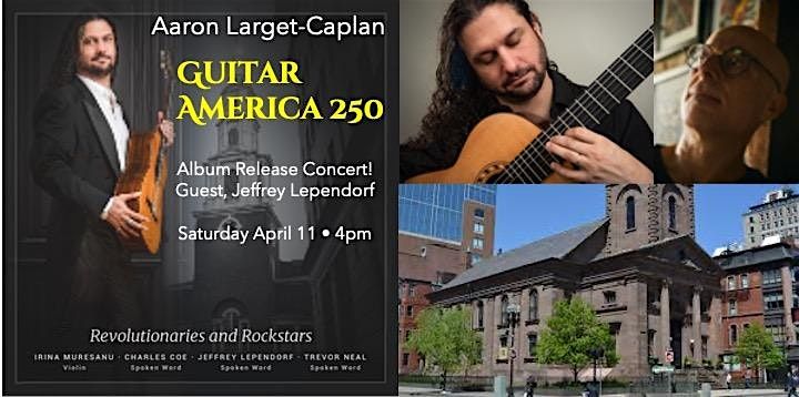 Join acclaimed Boston guitarist and composer Aaron Larget-Caplan for the release concert of Guitar America 250, a sweeping musical tribute to 250 years of American creativity and courage. Taking place Saturday, April 11 at 4pm in the beautiful Chapel of the Arlington Street Church, this one-hour program traces the nation’s evolving voice through music of revolutionaries, abolitionists, suffragists, immigrants, and rock legends.